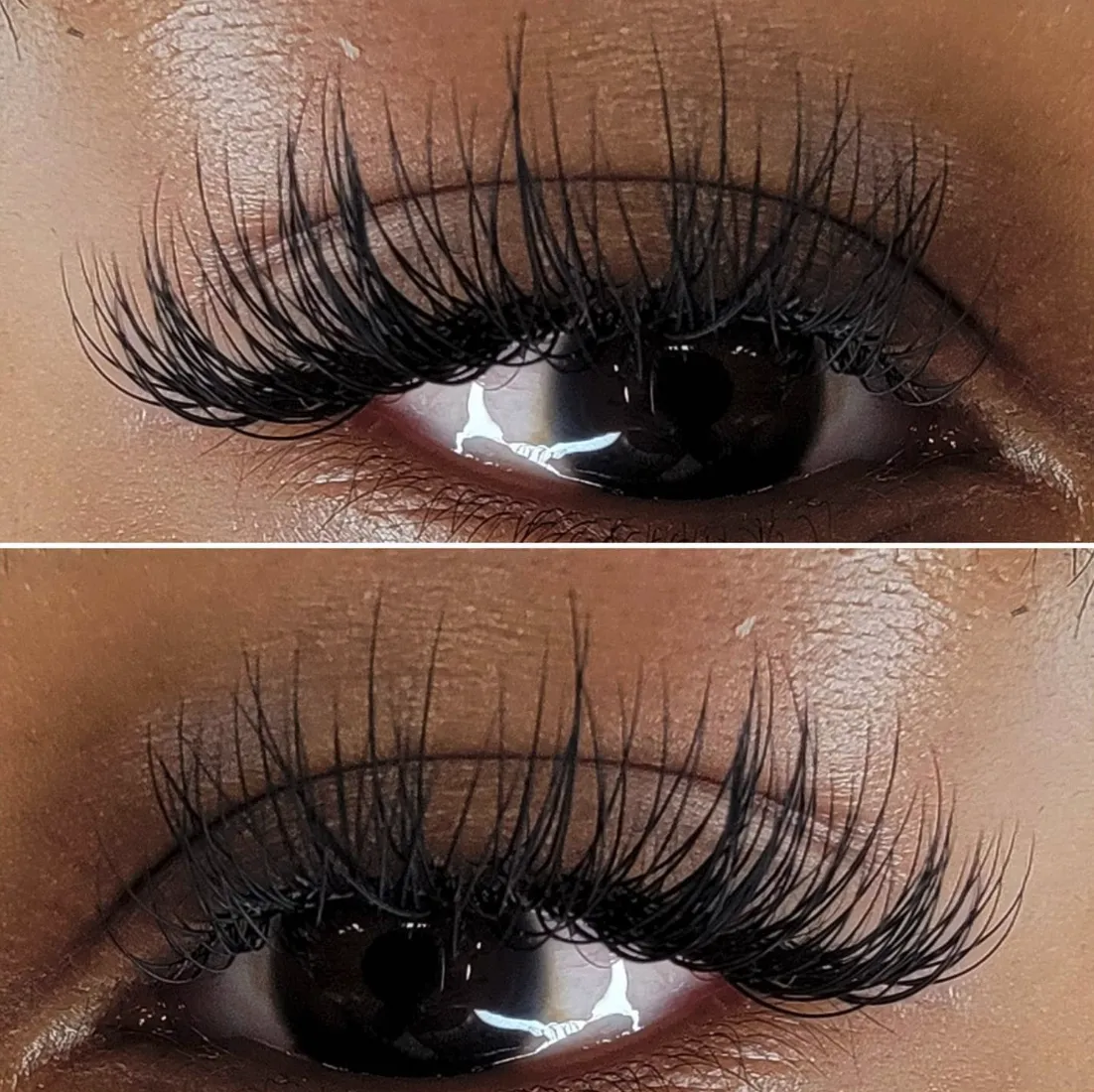 Hybrid eyelash extensions (hybrid fan lashes) are the half way step between a classic set of eyelash extensions. It enhances the eyes giving a more fuller /dramatic look